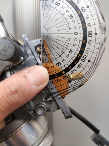油面調整 FCRが始動不可に陥った原因を確認するために、今まで弄ってなかった油面の確認から。 FCRセッティングマニュアルではフロートサポートの角度が15度でフロート高さを調整するというやや曖昧な指示。重力方向に垂線を引いて15度の角度にキャブを配置…