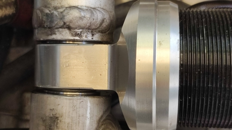 ベアリングにスリーブを入れて15x18x1シムとOリングを入れて上から15x22x1/12x22x1で抑ええます。M12ボルトとナットで左右を締めて幅22mmになっている事を確認します。本当なら24mmが欲しかった抑えシムが22mmしか無くてOリングの飛び出しが無いかちょっと心配ですが、負荷部分は全て鉄部品ですしもう一つのマウントベアリングが到着するまでの繋ぎです。