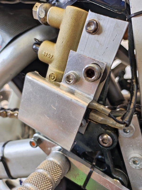 薄板で試作品として作成したブレーキSW等を保護するためのステップカバーが割れてきたので厚い板で作成したものの折り曲げる寸法を間違えて短くしてしまい内側のボルトを切るかカバーを浮かすかの2択になったため、ワッシャー追加しました。